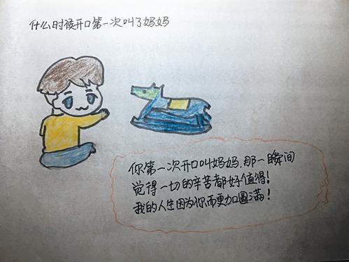 漫畫中,媽媽抱著襁褓里的嬰兒傷心地哭泣著,這是焦洋畫的漫畫中的一幅,是最揪心的一幅漫畫。旁邊配著焦洋用中性筆工工整整寫的大片文字?!耙?yàn)榍闆r危急,媽媽早產(chǎn)一個(gè)月,你出生就要和媽媽分開,你被送去另一個(gè)醫(yī)院……媽媽每天祈禱,盼著你快快出院,終于在半個(gè)月后把你從醫(yī)院抱回來,那是媽媽第一次抱你,看著你個(gè)小人兒從此與我息息相關(guān)。仿佛那一瞬間明白了責(zé)任是什么,謝謝你寶貝,讓我邁入人生的另一個(gè)階段?!?br /> 焦洋今年33歲,在8年前,她生下兒子派派。孩子的出生并不順利,早產(chǎn)了一個(gè)月,因?yàn)槿毖?,醫(yī)生甚至都建議家人放棄這條小生命??墒墙寡髨?jiān)決不放棄,只要有一絲希望就得拼盡全力?!爸宦牭揭宦暱奁缶捅会t(yī)生抱走,放進(jìn)保溫箱,我都沒看到他的模樣,讓我放棄,絕對(duì)不會(huì)同意的?!苯寡笳f,因?yàn)楹⒆右怀錾臓顩r非常糟糕,她只好獨(dú)自出院,留下還在保溫箱里的孩子。