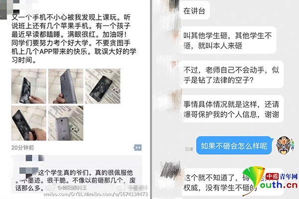 據(jù)微博內(nèi)容顯示,德陽一中學老師發(fā)現(xiàn)學生上課玩手機后要求學生將手機砸壞,事后在朋友圈贊賞該同學“耿直”,這種做法也引來爭議。有人表示,砸手機能讓學生記住教訓,避免再犯。而有的學生則表示,直接砸手機這種做法太過簡單粗暴,也可以交給家長,畢竟手機價格也不低。