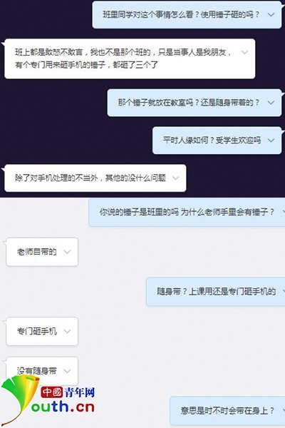 另一位目睹當晚情況的同學向中國青年網(wǎng)記者反映,手機是被老師拿錘子砸的,該老師男性,其專門備有一個砸手機的錘子。雖然老師平時對學生們很嚴厲,但教學水平很不錯。這次雖然學生有錯,但老師砸手機的處理方式有些欠妥。