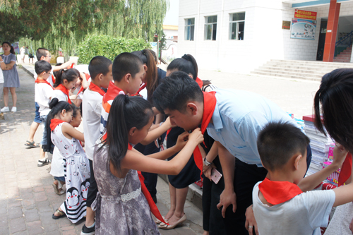 活動現(xiàn)場,公司職工在董事長張紫涵的帶領(lǐng)下同孩子們一起升國旗,進行學(xué)習(xí)用品的捐贈,并勉勵他們好好學(xué)習(xí),天天向上。為表示感謝,孩子們把紅領(lǐng)巾親自給叔叔阿姨們系上,學(xué)校校長張喜年也把一面“愛心捐助,善行義舉”的錦旗送到董事長張紫涵的手中。(李濤 攝)