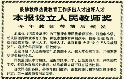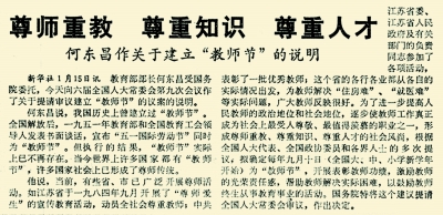 其實(shí),這并非我國(guó)第一次提出“教師節(jié)”的概念。據(jù)本報(bào)1985年1月16日1版《何東昌作關(guān)于建立“教師節(jié)”的說(shuō)明》一文記載,新中國(guó)成立后,1951年教育部和全國(guó)教育工會(huì)領(lǐng)導(dǎo)人發(fā)表書(shū)面談話,宣布“五一國(guó)際勞動(dòng)節(jié)”同時(shí)為“教師節(jié)”。但執(zhí)行的結(jié)果是“教師節(jié)”實(shí)際上并不存在。