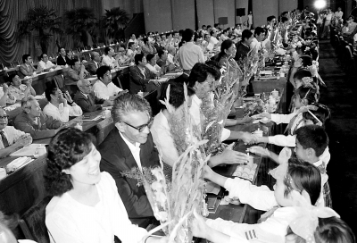 ▲1989年北京市慶祝教師節(jié)表彰大會(huì)上,少先隊(duì)員向優(yōu)秀教師和優(yōu)秀教育工作者代表獻(xiàn)花。葉用才/攝