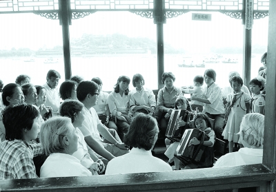▼1986年教師節(jié)前夕,東城區(qū)安定門(mén)街道舉行游船聯(lián)歡活動(dòng),慰問(wèn)中小學(xué)和幼兒園教師。王振民/攝