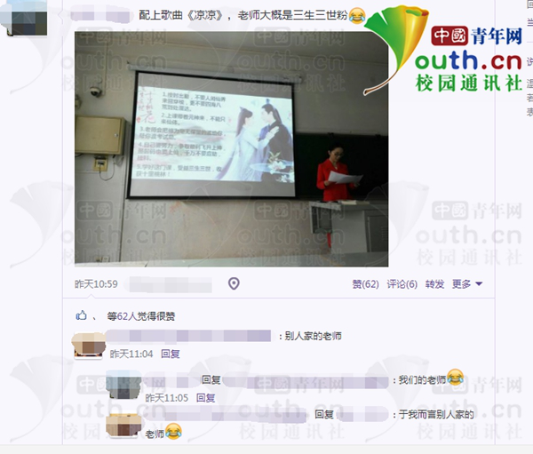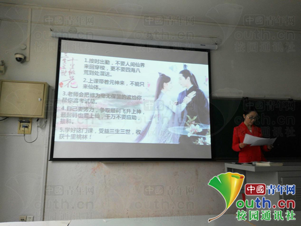 “我也是剛來學校不久,與他們相差也不大,比較了解他們的心理。課上我是老師,課下我更希望我們是朋友?!彼χf表示,自己也是“三生三世粉”,用這樣的勸學體開課比較有趣,讓學生更能理解。同時縮小了我?guī)熒g的距離,讓大家更親近。