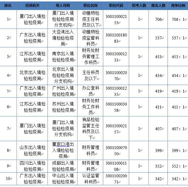 2018年國考出入境各部門競爭最激烈的十大職位(數(shù)據(jù)截至11月5日16:00)