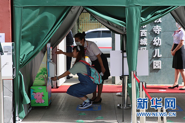 新華網(wǎng)北京6月4日電 6月3日,為做好兒童返園準(zhǔn)備,北京市西城區(qū)三教寺幼兒園進(jìn)行了開園模擬演練。此次演練由幼兒園老師扮演家長和孩子,旨在讓老師知曉幼兒園防護(hù)措施且有的放矢地去開展活動(dòng),并通過線上的方式讓孩子們知道如何進(jìn)行自我保護(hù)。