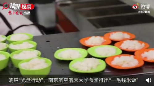 南京航空航天大學食堂則推出了“一毛錢米飯”。食堂有售價6毛、4毛、1毛的不同分量米飯,50克的米飯僅需一毛錢。