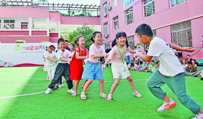 浙江仙居縣第一小學(xué)內(nèi),一年級(jí)新生們正在玩老鷹捉小雞游戲。王華斌攝/光明圖片