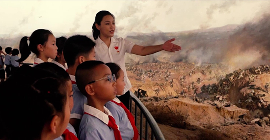 遼沈戰(zhàn)役紀念館講解員姚璐璐在全景畫館為小學生講述戰(zhàn)斗故事。
