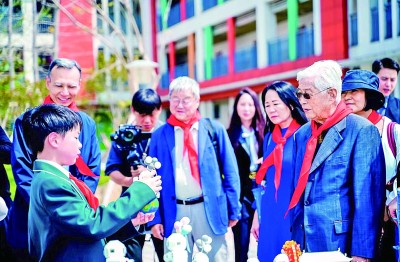 4月10日,中國(guó)科技館原館長(zhǎng)王渝生(中)在重慶明遠(yuǎn)未來小學(xué)參加科普活動(dòng)。光明圖片