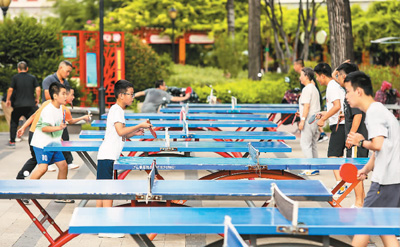 8月8日,在山東省滕州市弘道公園內(nèi),市民正在打乒乓球。宋海存攝(人民視覺(jué))