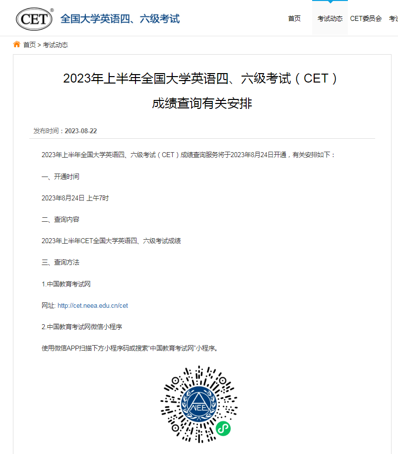 8月22日,中國(guó)教育考試網(wǎng)發(fā)布消息,2023年上半年全國(guó)大學(xué)英語(yǔ)四、六級(jí)考試(CET)成績(jī)查詢服務(wù)將于2023年8月24日上午7時(shí)開通。