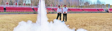 在哈爾濱工業(yè)大學(xué)體育場,航模協(xié)會的學(xué)生操控航模點(diǎn)火發(fā)射。新華社發(fā)