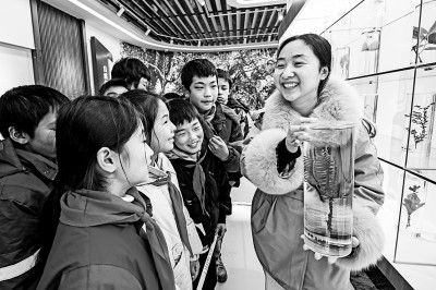 江西省撫州市資溪縣馬頭山林場野生中藥資源科普館,指導(dǎo)老師為鎮(zhèn)中心小學(xué)學(xué)生講解珍稀藥材香榧的功效與作用。 吳志貴攝/光明圖片