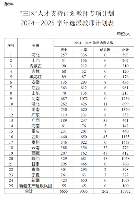 根據(jù)《通知》,2024—2025學(xué)年全國計劃選派15952名教師,其中初中計劃選派6655名,小學(xué)計劃選派9035名,幼兒園計劃選派262名。選派教師主要由各?。▍^(qū)、市)和新疆生產(chǎn)建設(shè)兵團在本行政區(qū)域范圍內(nèi)調(diào)配,調(diào)動省會城市、中心城市、非受援縣的優(yōu)質(zhì)教師資源支持省內(nèi)受援縣。