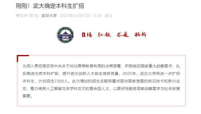 3月7日,據(jù)武漢大學微信公眾號消息,為深入貫徹落實黨中央關于優(yōu)化高等教育布局的決策部署,積極響應國家重大戰(zhàn)略需求,扎實推進優(yōu)質(zhì)本科擴容,提升拔尖創(chuàng)新人才自主培養(yǎng)質(zhì)量,2025年,武漢大學將進一步擴招本科生,計劃招生7300人。此次增加的招生名額將重點面向國家急需的前沿技術和新興業(yè)態(tài),著力培養(yǎng)人工智能與多學科交叉的復合型人才,以更好地服務國家戰(zhàn)略需求與社會發(fā)展需要。