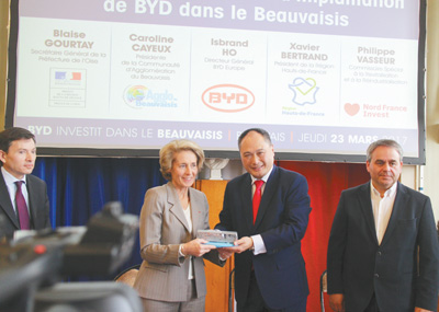 本報(bào)法國博韋3月23日電 (記者曹鵬程、殷新宇、李鶴)中國企業(yè)比亞迪23日在此間宣布,向法國上法蘭西大區(qū)投資1000萬歐元,成立電動(dòng)汽車組裝廠。比亞迪歐洲區(qū)總經(jīng)理何一鵬、上法蘭西大區(qū)議會(huì)主席格扎維埃·貝特朗、博韋市市長卡洛琳娜·卡耶出席了新聞發(fā)布會(huì)。