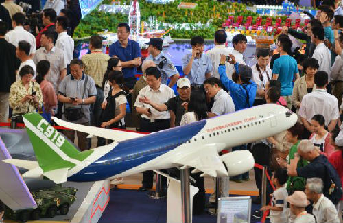 2016年6月7日,觀眾在國(guó)家“十二五”科技創(chuàng)新成就展上參觀國(guó)產(chǎn)C919飛機(jī)模型。(新華社)