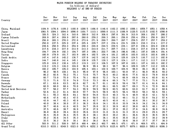 據(jù)2月15日美國財政部公布的數(shù)據(jù),截至2017年12月,中國持有美國國債1.18萬億美元,較上個月增持83億美元,為美國最大的海外債券持有國,其次為日本。2017年全年來看,中國共增持美國國債1265億美元,增持力度創(chuàng)下2010年以來最大。