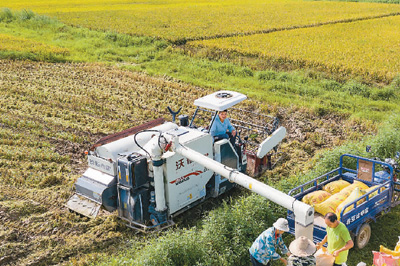 日前,江西省新余市渝水區(qū)羅坊鎮(zhèn)東邊村稻田內(nèi),農(nóng)民駕駛農(nóng)機(jī)搶收早稻。趙春亮攝(人民視覺)