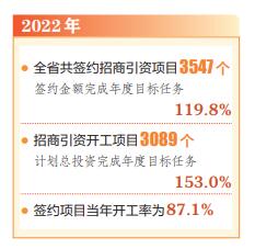 本報(bào)訊(記者閆杰)2月15日,記者從省投資促進(jìn)局獲悉,2022年,我省產(chǎn)業(yè)鏈精準(zhǔn)招商取得積極進(jìn)展。據(jù)統(tǒng)計(jì),2022年,全省共簽約招商引資項(xiàng)目3547個(gè),簽約金額完成年度招商引資簽約目標(biāo)任務(wù)的119.8%。招商引資開工項(xiàng)目3089個(gè),計(jì)劃總投資完成年度目標(biāo)任務(wù)的153.0%,簽約項(xiàng)目當(dāng)年開工率為87.1%。全省招商引資形成固定資產(chǎn)投資項(xiàng)目到位資金完成年度目標(biāo)任務(wù)的225.8%,非固定資產(chǎn)投資項(xiàng)目到位資金完成年度目標(biāo)任務(wù)的202.7%。