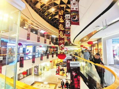 晚上6時30分,走進(jìn)省城龍湖萬達(dá)廣場,遠(yuǎn)遠(yuǎn)的,霓虹燈閃爍,商場內(nèi)的喜慶裝飾讓人眼花繚亂,“龍運當(dāng)頭”“龍年大吉”“金龍賀歲”等祝福語隨處可見,各個商家門頭上設(shè)置的龍年掛飾為節(jié)日氛圍增色添彩,很多商品無論外形還是包裝,都巧妙地融入了龍年的獨特元素,市民們踏著歡快的新春背景音樂,挑選著年貨賀禮。