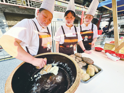 9月3日傍晚,太原鐘樓街,來(lái)自嵐縣的廚師正在制作當(dāng)?shù)靥厣朗惩炼埂澳酶狻薄=?,隨著“跟著悟空游山西”的持續(xù)升溫,太原鐘樓街吸引了眾多游客,品嘗富有山西特色的美食成為人們打卡鐘樓街的主要內(nèi)容。