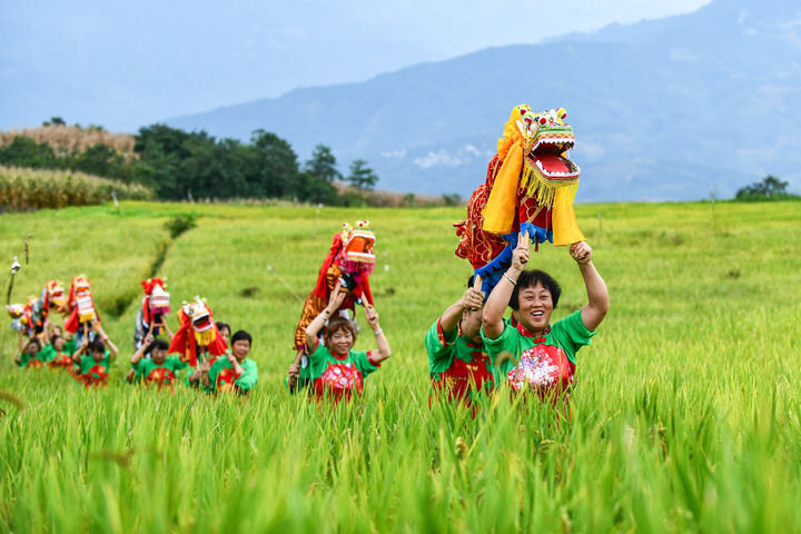 在云南省紅河哈尼族彝族自治州個(gè)舊市卡房鎮(zhèn)的旱地優(yōu)質(zhì)稻種植示范區(qū),群眾抬著板凳龍?jiān)谔镩g穿行迎接豐收季的到來(2024年9月20日攝)。新華社記者 王靜頤 攝