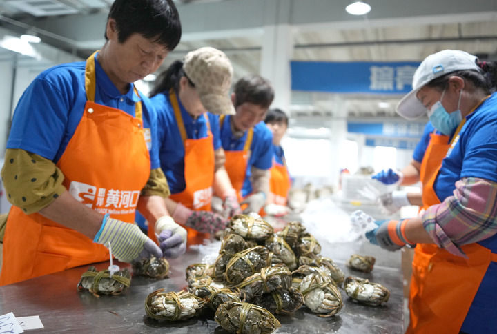 山東省東營(yíng)市墾利區(qū)的一處大閘蟹加工車間的工作人員對(duì)新鮮的大閘蟹進(jìn)行分選和捆扎(2024年9月10日攝)。新華社記者 徐速繪 攝