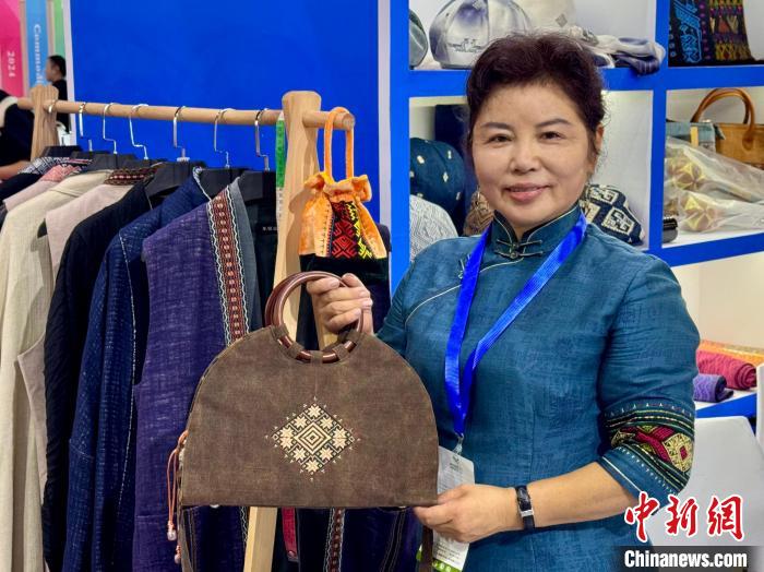 10月13日,來自海南的琴韻幽蘭品牌設計師王彬妮展示黎錦元素面料制成的產品。董易鑫 攝
