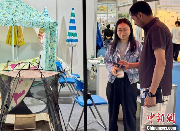 10月13日,一位外商(右一)在中國義烏文化和旅行產品交易博覽會了解戶外產品。董易鑫 攝
