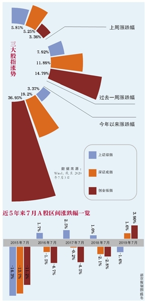 新京報(bào)記者統(tǒng)計(jì)了2010年7月-2019年7月間的數(shù)據(jù)發(fā)現(xiàn),事實(shí)上,指數(shù)在過(guò)去的10年中上漲與下跌的各約占半數(shù)。其中,滬指方面,近10年里,滬指6次在7月出現(xiàn)上漲,4次出現(xiàn)下跌。2010年7月為近10年的7月里上漲幅度最高的一年,漲幅為9.97%;2015年7月,滬指大幅下跌14.34%,是十年中7月跌幅最高的一年。