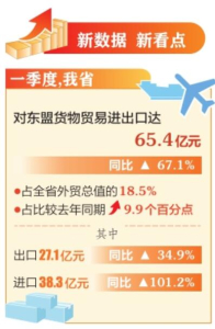 本報訊(記者孟婷)5月15日,記者從太原海關(guān)獲悉,今年一季度,我省對東盟貨物貿(mào)易進出口達65.4億元,同比增長67.1%,占全省外貿(mào)總值的18.5%,占比較去年同期提升9.9個百分點。其中,出口27.1億元,同比增長34.9%;進口38.3億元,同比增長101.2%。3月份,我省對東盟進出口25.8億元,同比增長101.4%,其中出口11億元,同比增長50%;進口14.8億元,同比增長169.6%。