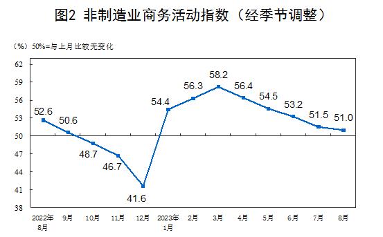 此外,在中國非制造業(yè)采購經(jīng)理指數(shù)運(yùn)行情況方面,8月份,非制造業(yè)商務(wù)活動指數(shù)為51.0%,比上月下降0.5個百分點(diǎn),仍高于臨界點(diǎn),非制造業(yè)持續(xù)擴(kuò)張。