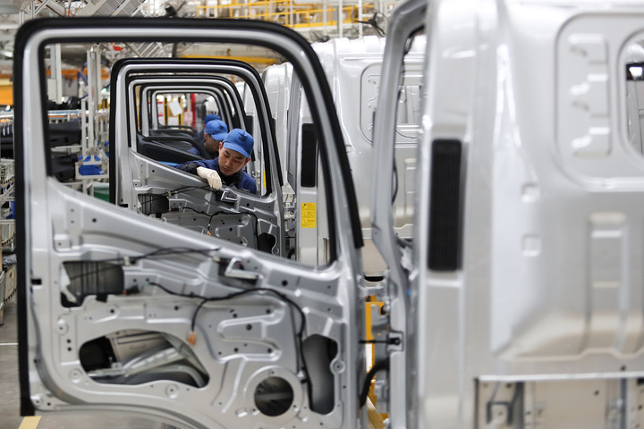 2024年1月8日,河南商丘首批地產(chǎn)新能源輕卡車下線,工人在組裝車間工作。新華社發(fā)