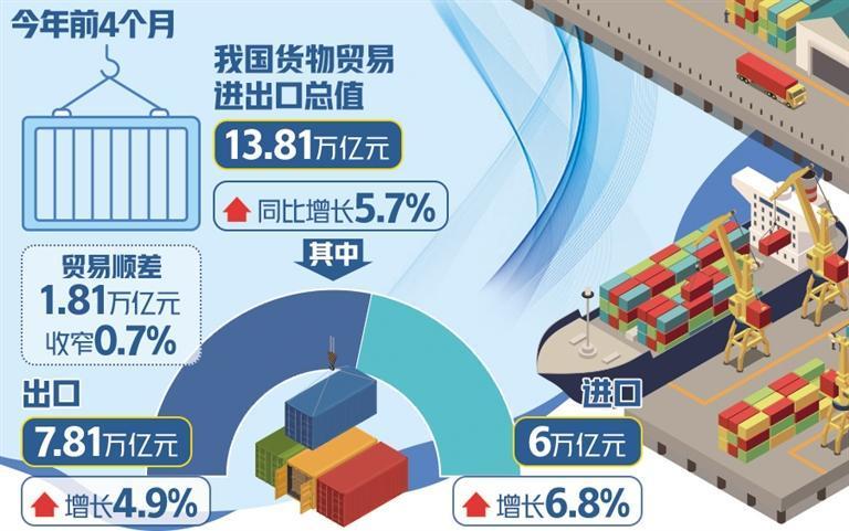 4月份,我國進(jìn)出口總額3.64萬億元,增長8%。其中,出口2.08萬億元,增長5.1%;進(jìn)口1.56萬億元,增長12.2%。