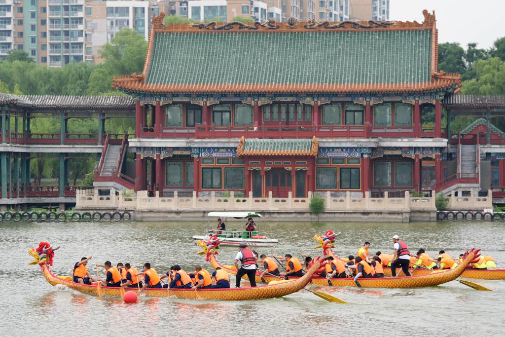 6月5日,2024龍?zhí)抖宋缥幕?jié)活動(dòng)在北京市東城區(qū)龍?zhí)豆珗@舉辦。這是2024龍?zhí)抖宋缥幕?jié)龍舟比賽現(xiàn)場(chǎng)。新華社記者 鞠煥宗 攝