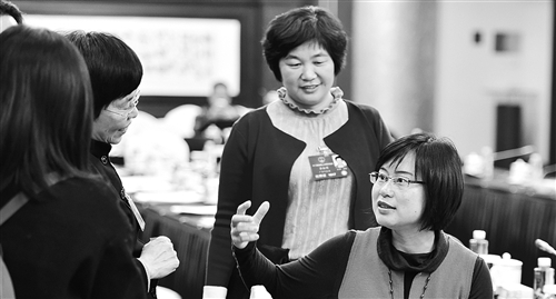 3月11日,人大廣東代表團(tuán)在駐地舉行分組會(huì)議。全國人大代表龍芳(右一)、李淑明(右二)與同團(tuán)代表在討論“一帶一路”戰(zhàn)略對廣東企業(yè)“走出去”產(chǎn)生的影響。本報(bào)記者 李景錄攝