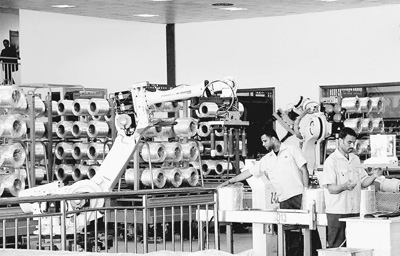 2015年,新蘇伊士運河的開通拉動了埃及的制造業(yè)和基礎(chǔ)設(shè)施建設(shè)。圖為在北非最大的玻璃纖維制造企業(yè)埃及巨石公司,埃及員工與“機(jī)械手臂”一同生產(chǎn)的場景。王云松攝