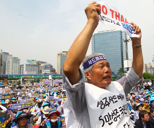 韓國(guó)民眾舉行集會(huì)反對(duì)部署“薩德”系統(tǒng) 。新華社記者 姚琪琳 攝