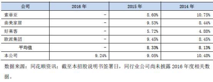 2013年至2016年,尚品宅配綜合毛利率分別為47.01%、44.82%、44.96%和 46.19%,高于同行業(yè)公司的平均水平,2014至2016年,同行業(yè)公司綜合業(yè)務(wù)毛利率平均值為34.85%和36.30%。