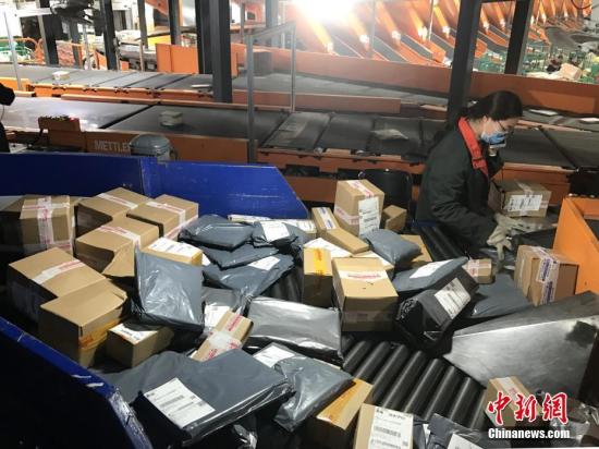 資料圖:湖南長沙郵區(qū)中心局的工作人員正在處理堆積的快遞包裹。中新社記者 唐小晴 攝
