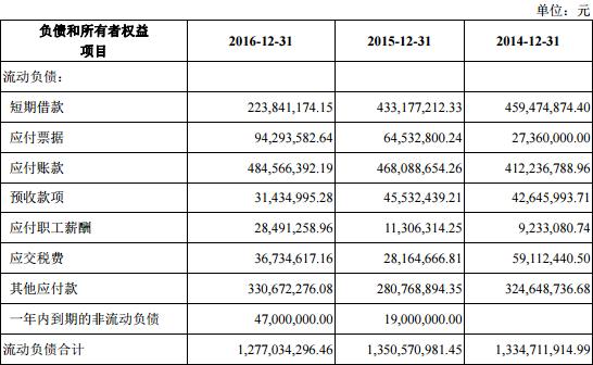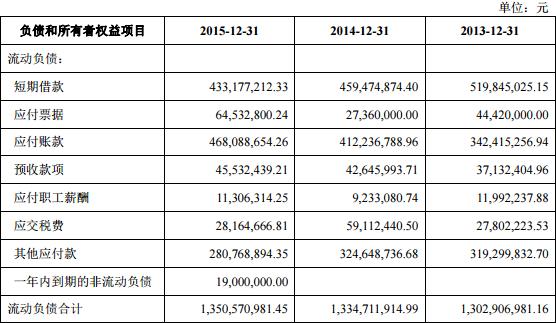 招股書數(shù)據(jù)顯示,蒙娜麗莎2013年至2016年負(fù)債總計(jì)分別為13.27億元、14.22億元、14.15億元、13.56億元;流動負(fù)債分別為13.03億元、13.35億元、13.51億元、12.77億元。