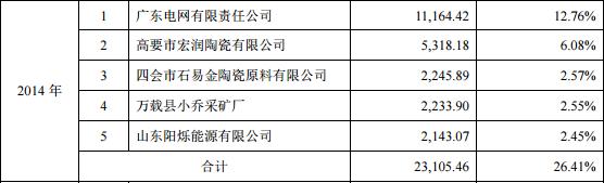 在新版的招股書中,2015年,公司前5大供應(yīng)商分別是廣東電網(wǎng)有限責(zé)任公司、高要市宏潤陶瓷有限公司、佛山市圣八達(dá)貿(mào)易有限公司、萬載縣小喬采礦廠、萬載灝翔達(dá)采礦廠,采購金額分別為10220.23萬元、5427.98 萬元、2402.34 萬元、 2276.07 萬元、2253.53萬元,占采購總額的比例分別為12.04%、 6.40%、2.83%、2.68%、2.66%。