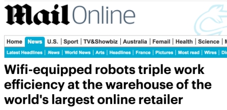 8月2日,英國《每日郵報》發(fā)表題為《裝載無線網(wǎng)絡(luò)的機(jī)器人將中國最大在線零售商倉庫的效率翻了三倍》的文章。文章介紹了日前投入使用的中國最大機(jī)器人倉庫,已有超過百臺機(jī)器人在倉庫內(nèi)運行。