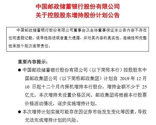 備受市場關(guān)注的是,同日,郵儲銀行還發(fā)布了《關(guān)于控股股東增持股份計劃公告》。公告稱,控股股東中國郵政集團(tuán)公司(下稱郵政集團(tuán))計劃自2019年12月10日起12個月內(nèi)擇機(jī)增持該行A股股份,增持金額不少于25億元。這體現(xiàn)了控股股東對郵儲銀行投資價值的高度認(rèn)可,也將為證券市場的穩(wěn)定運行創(chuàng)造良好環(huán)境,彰顯“國家隊”擔(dān)當(dāng)。