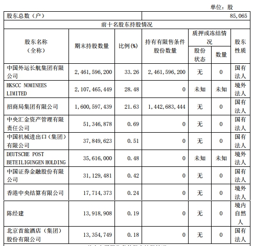 10月30日,中國外運發(fā)布第三季度報告。截至2019年9月30日,中國外運前三名股東持股情況為:中國外運長航集團有限公司持有24.62億股,持股比例33.26%;HKSCC NOMINEES LIMITED持有21.07億股,持股比例28.48%;招商局集團持有16.01億股,持股比例21.63%。