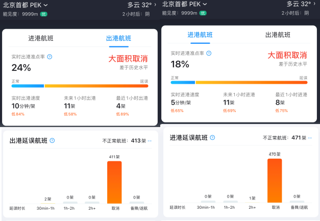 受各大航空公司退票處置方案的影響,航班大面積取消。飛常準(zhǔn)數(shù)據(jù)顯示,截至6月22日15時15分,北京首都國際機(jī)場當(dāng)日出港航班大面積取消,實時出港準(zhǔn)點率僅為24%,413架不正常航班中有411架航班取消出港;同樣,當(dāng)日入港航班大面積取消,實時入港準(zhǔn)點率僅為18%,471架不正常航班中有470架航班取消入港。