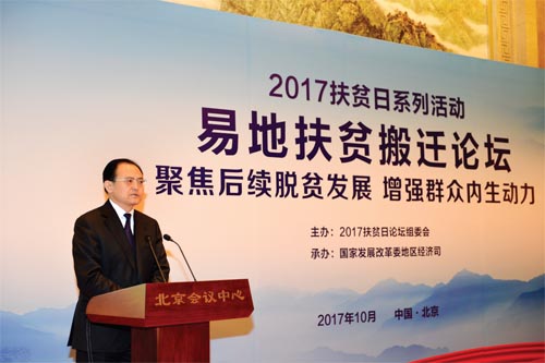 本次論壇以“聚焦后續(xù)脫貧發(fā)展,增強群眾內生動力”為主題,是2017 年扶貧日系列活動之一。來自國家發(fā)改委、人力資源社會保障部、國土資源部、交通運輸部、水利部、農業(yè)部、商務部、中國人民銀行、國家林業(yè)局、國家旅游局、銀監(jiān)會、國務院扶貧辦、全國工商聯、國家開發(fā)銀行、中國農業(yè)發(fā)展銀行等部門和單位有關司局負責同志,全國22 個有易地扶貧搬遷任務的省份發(fā)展改革委負責同志以及部分省、市、縣從事易地扶貧搬遷工作的干部群眾,帶動搬遷群眾脫貧致富的部分龍頭企業(yè)代表,共約100 人參加了論壇。