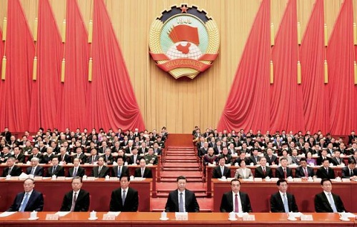 習近平、李克強、栗戰(zhàn)書、王滬寧、趙樂際、韓正、王岐山等在主席臺就座。